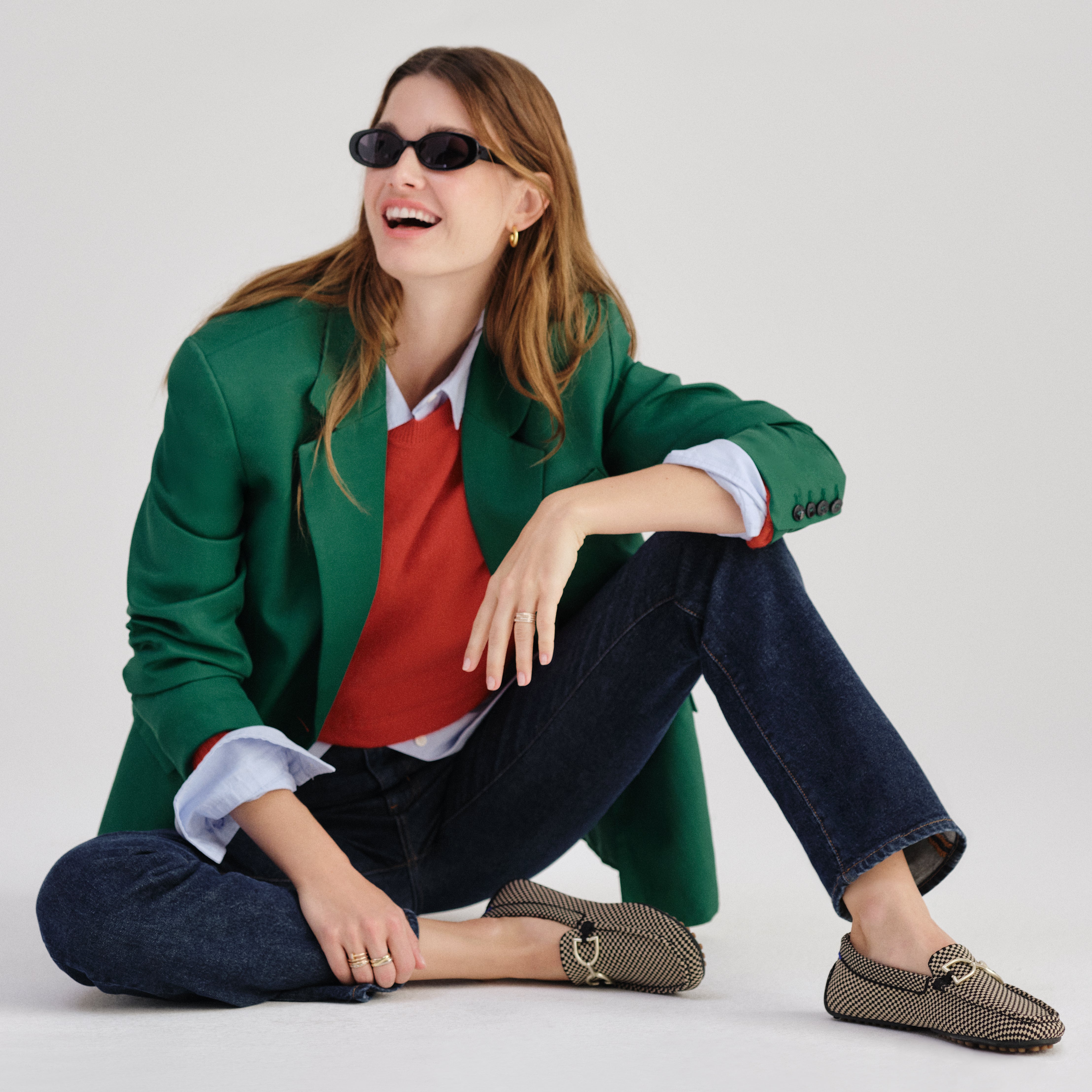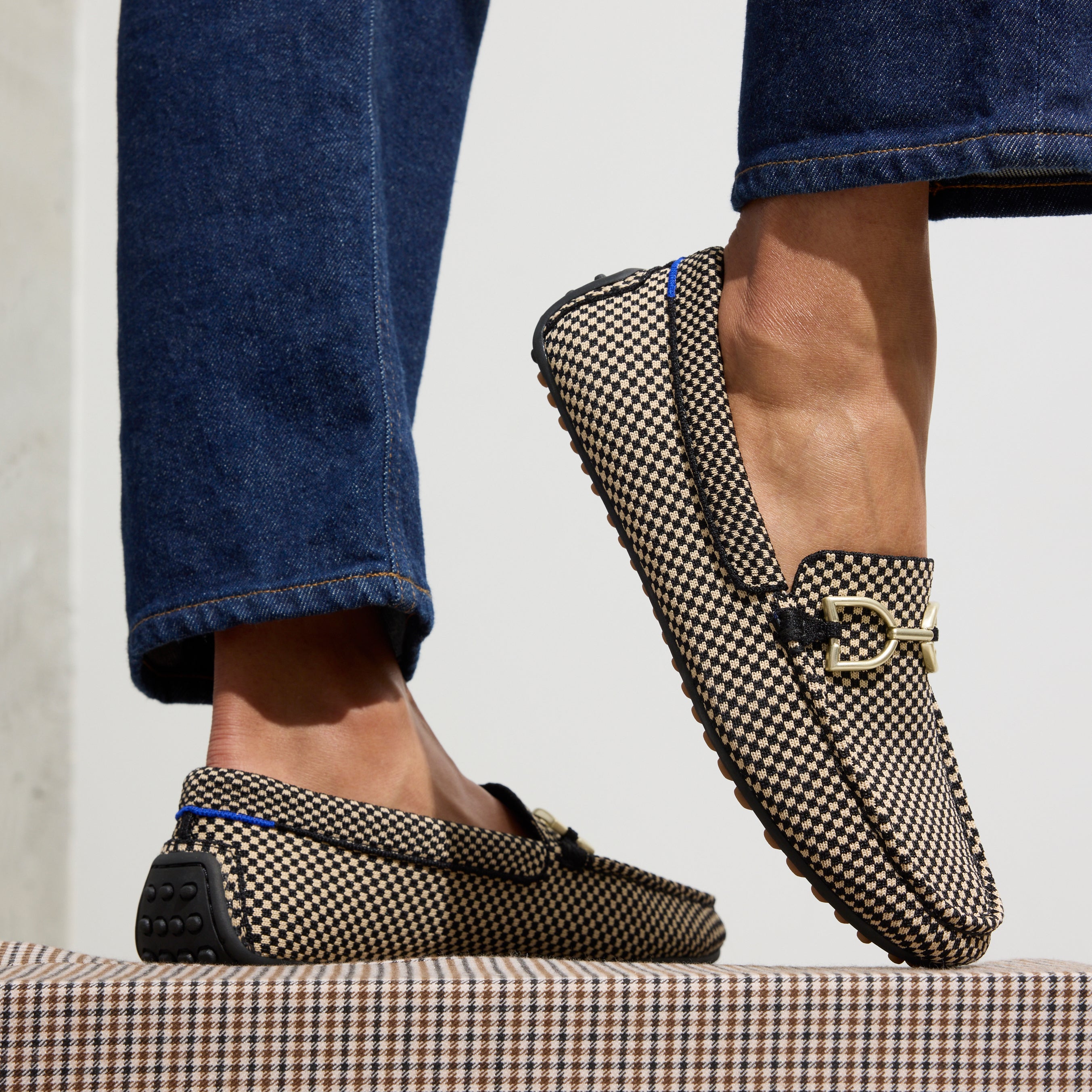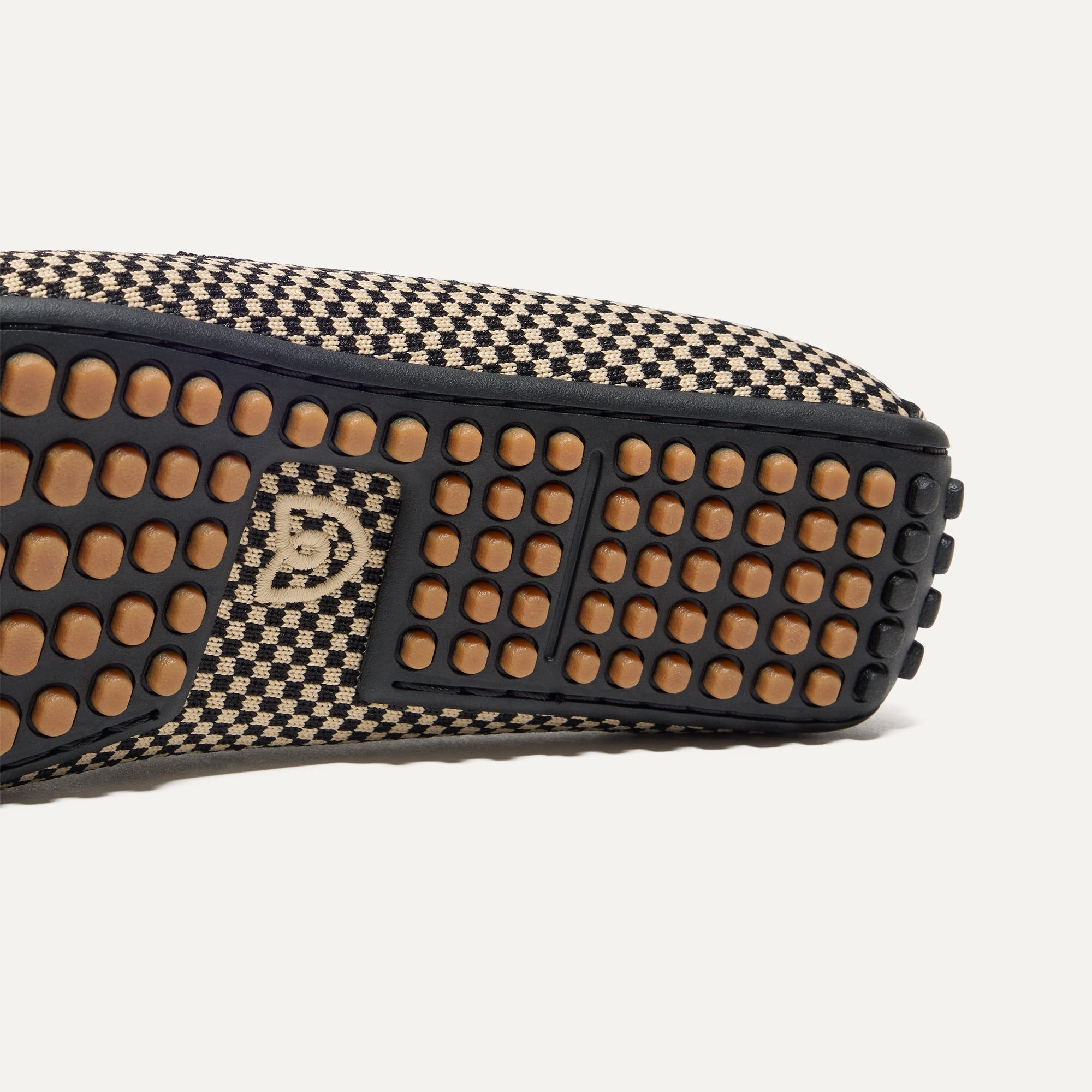 Soft, flexible upper in an ivory and black micro checkered pattern with a gold hardware signet bit on the vamp.