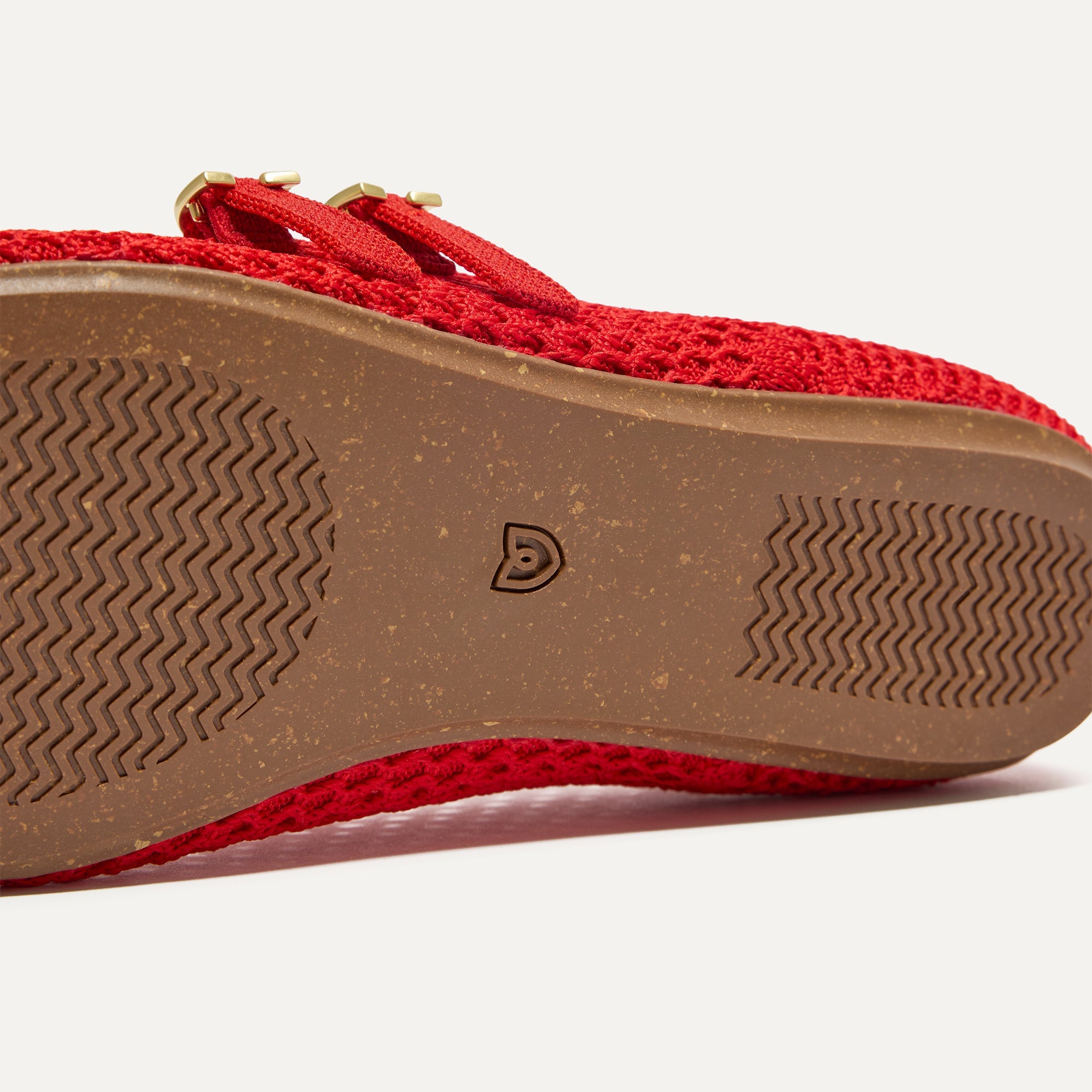 Comfortable insoles in bright red and durable tan rubber outsoles.
