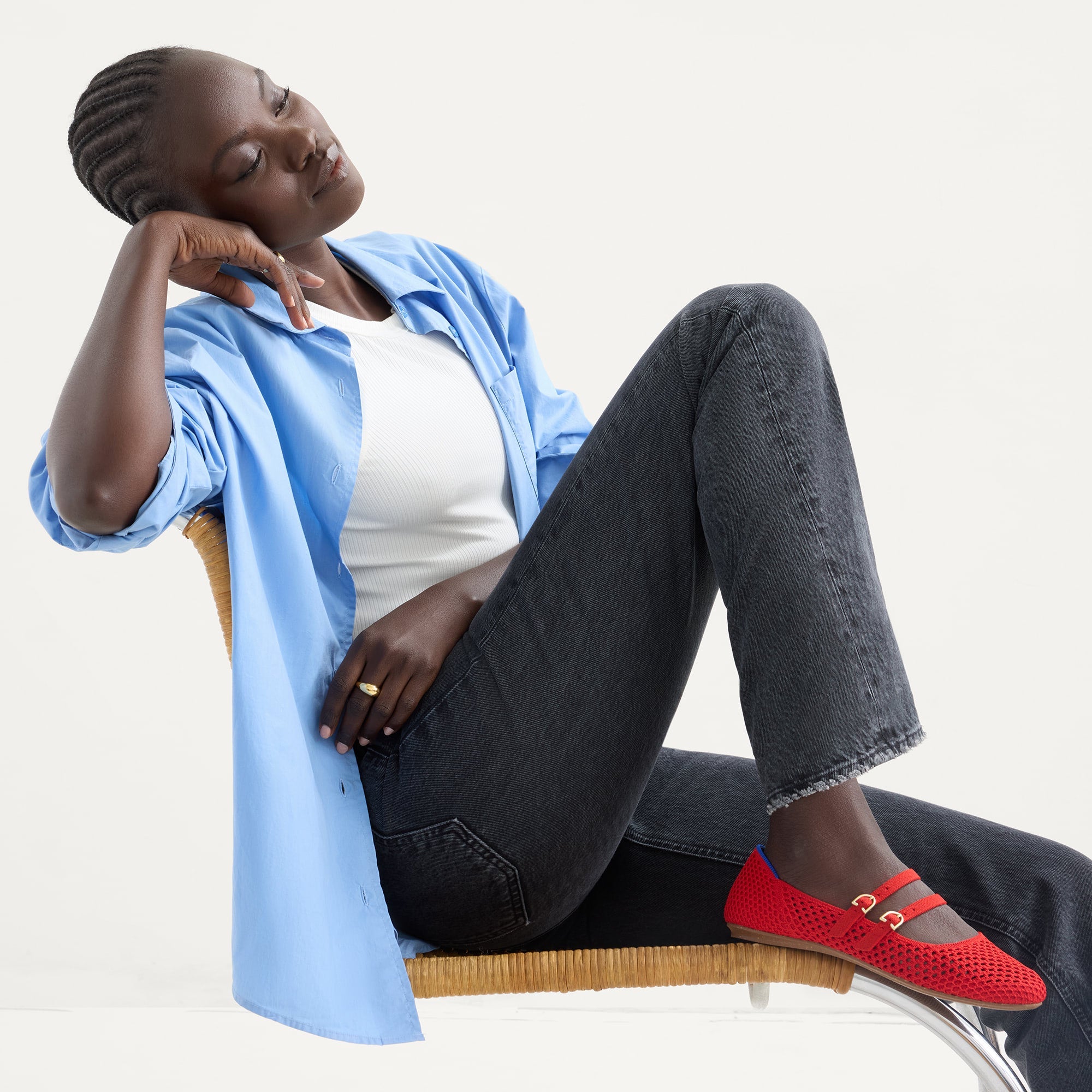Features two slim, flexible straps with adjustable buckles inspired by the Rothy’s signet.