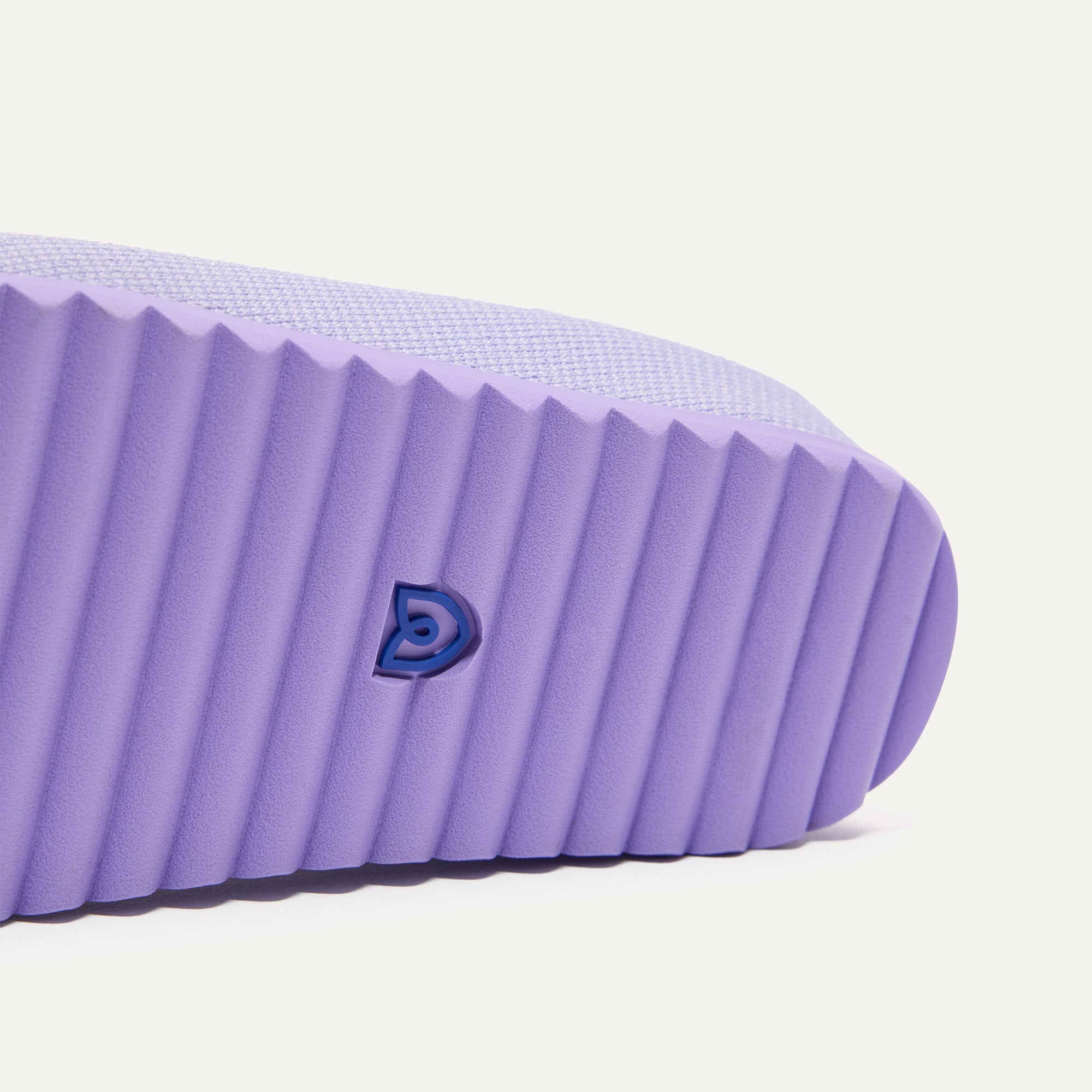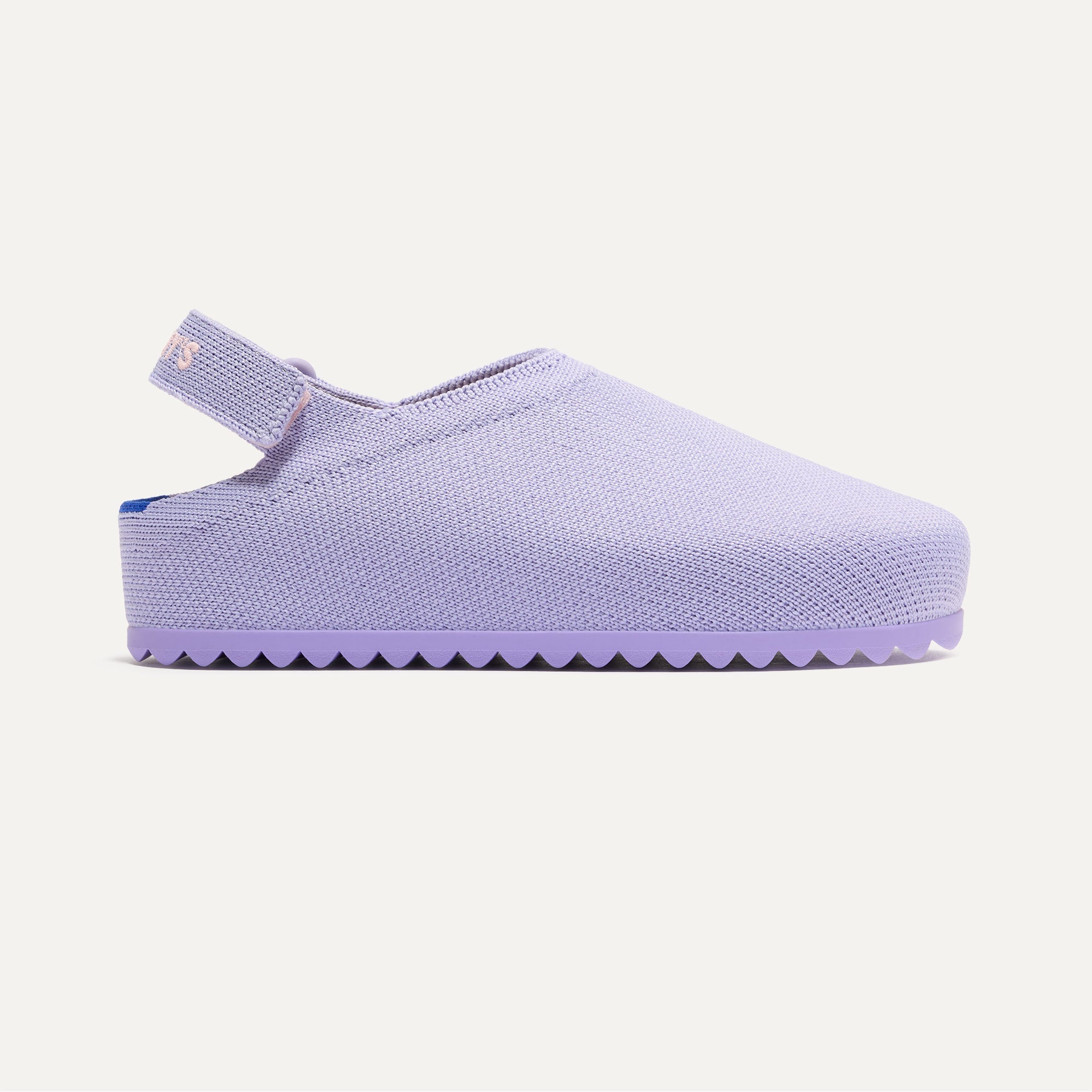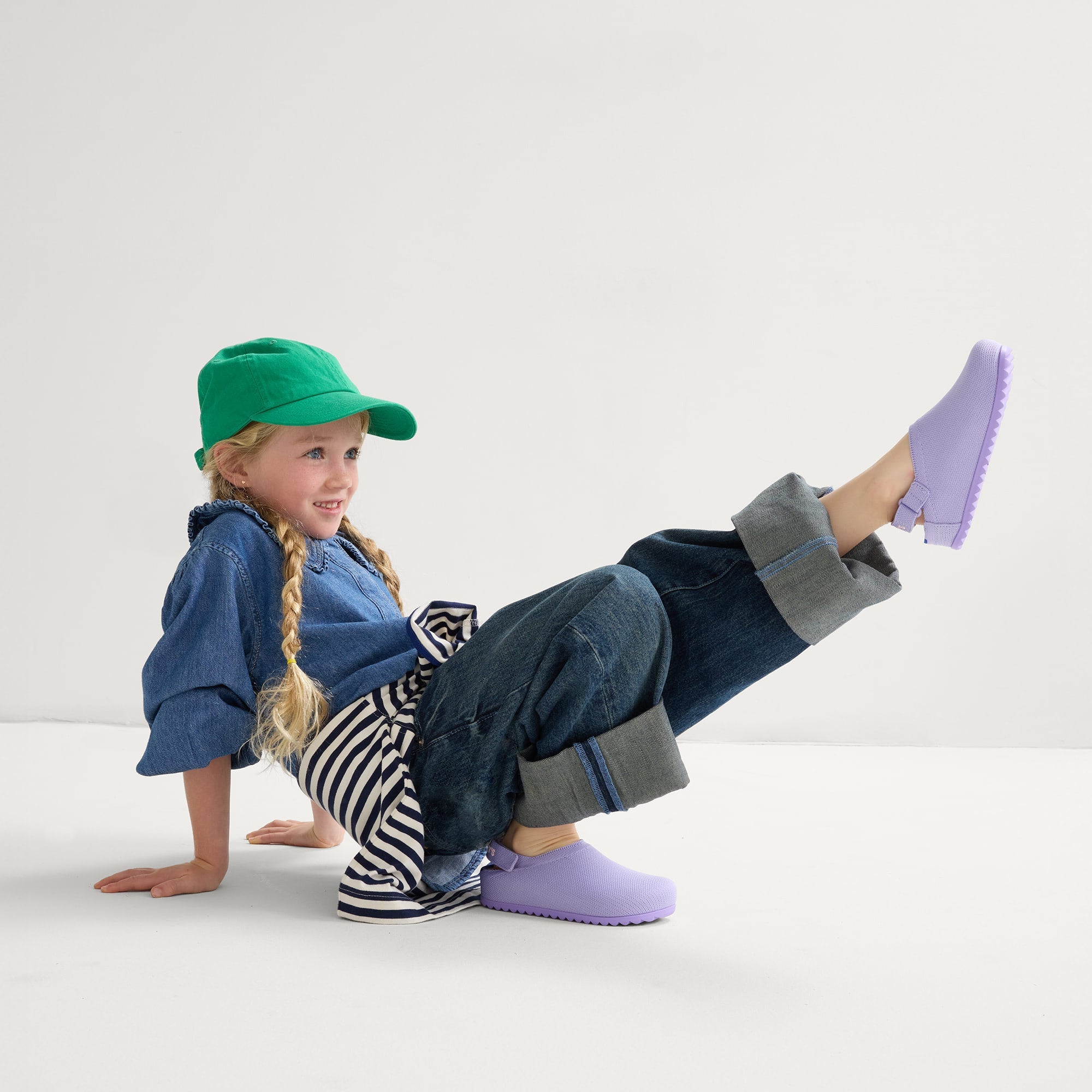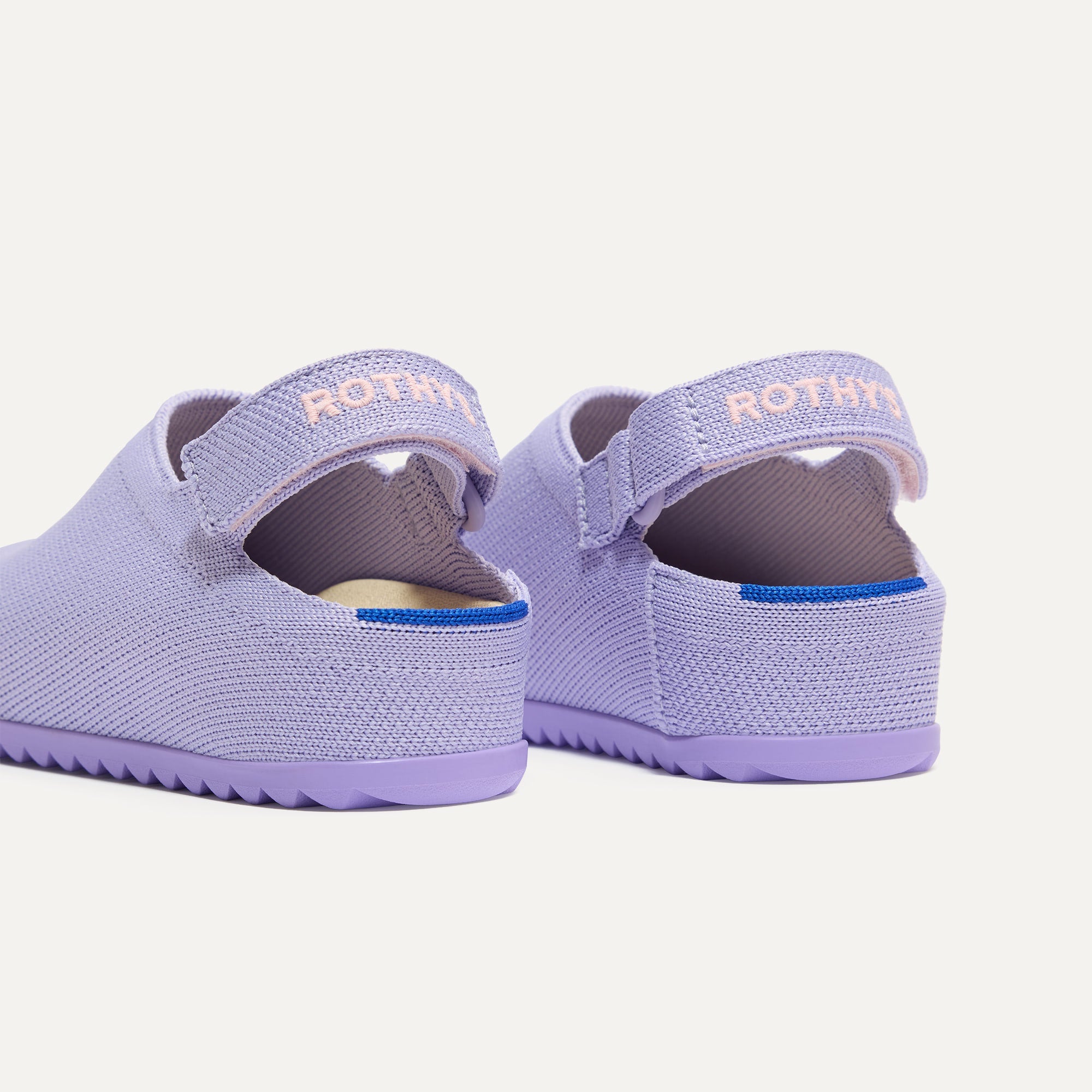Features a comfortable, adjustable hook & loop heelstrap in light lavender to keep their little feet secure.