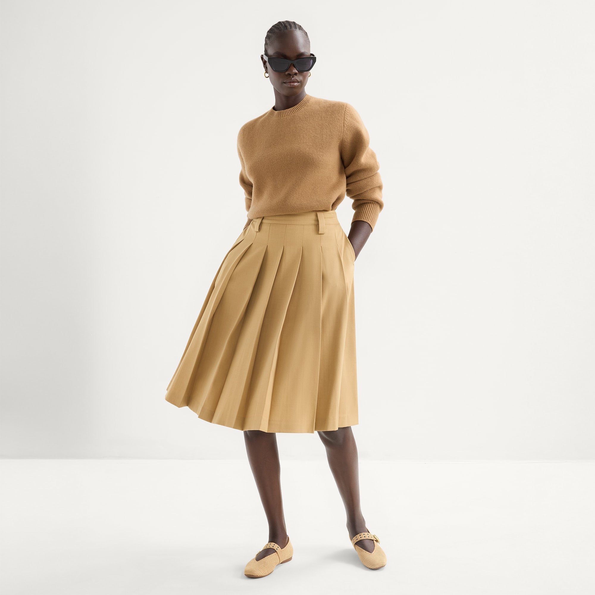Knit, woven upper in tan with a square toe box and a sharp V-shaped vamp.