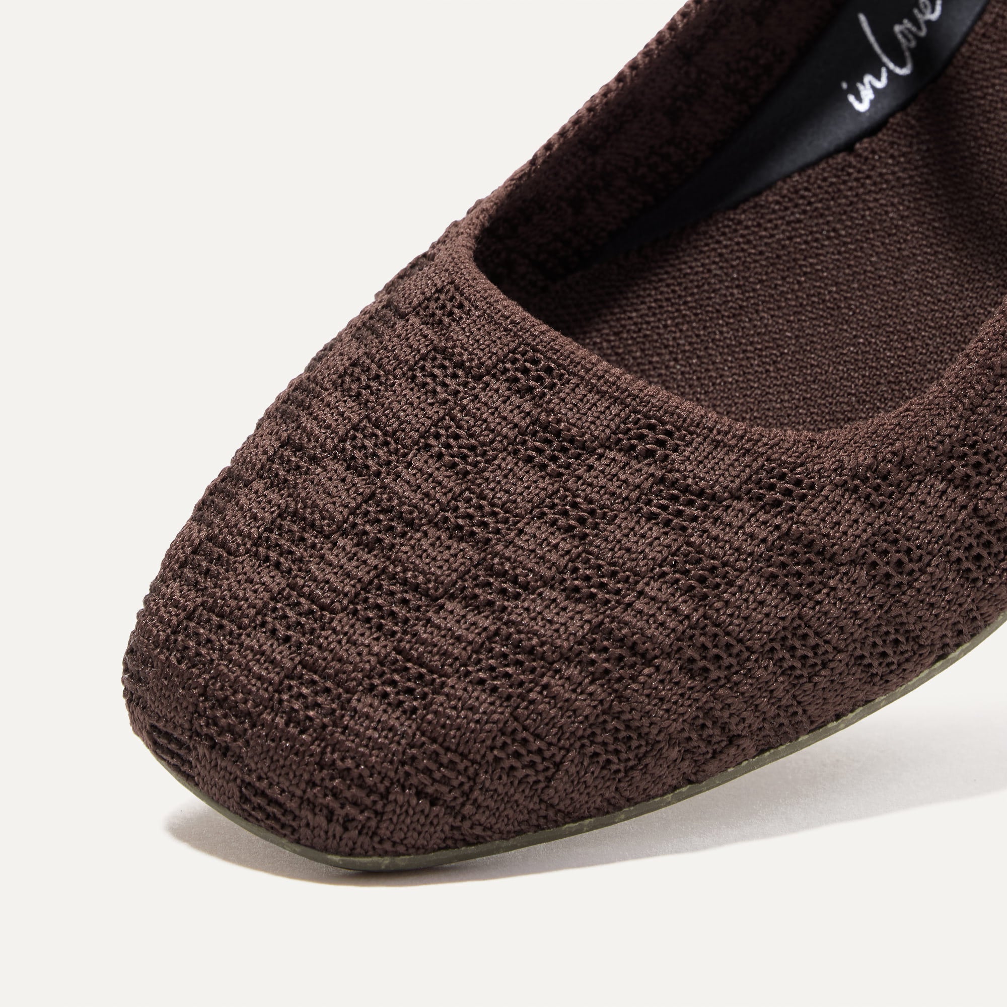 Soft, flexible upper knit with a dark brown basketweave pattern.
