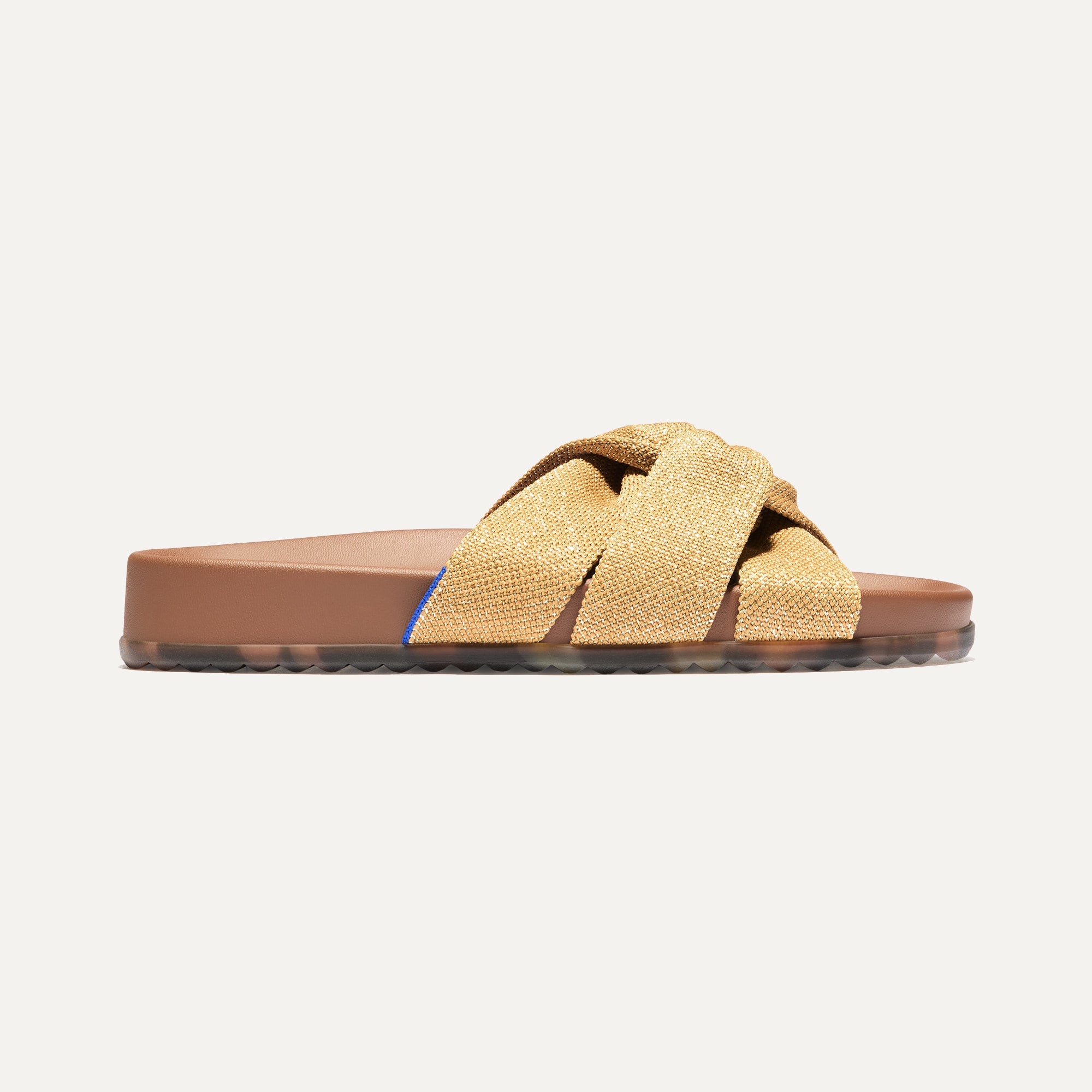 Softly knit upper in a shimmery metallic gold features three wide straps that twist into a knot.