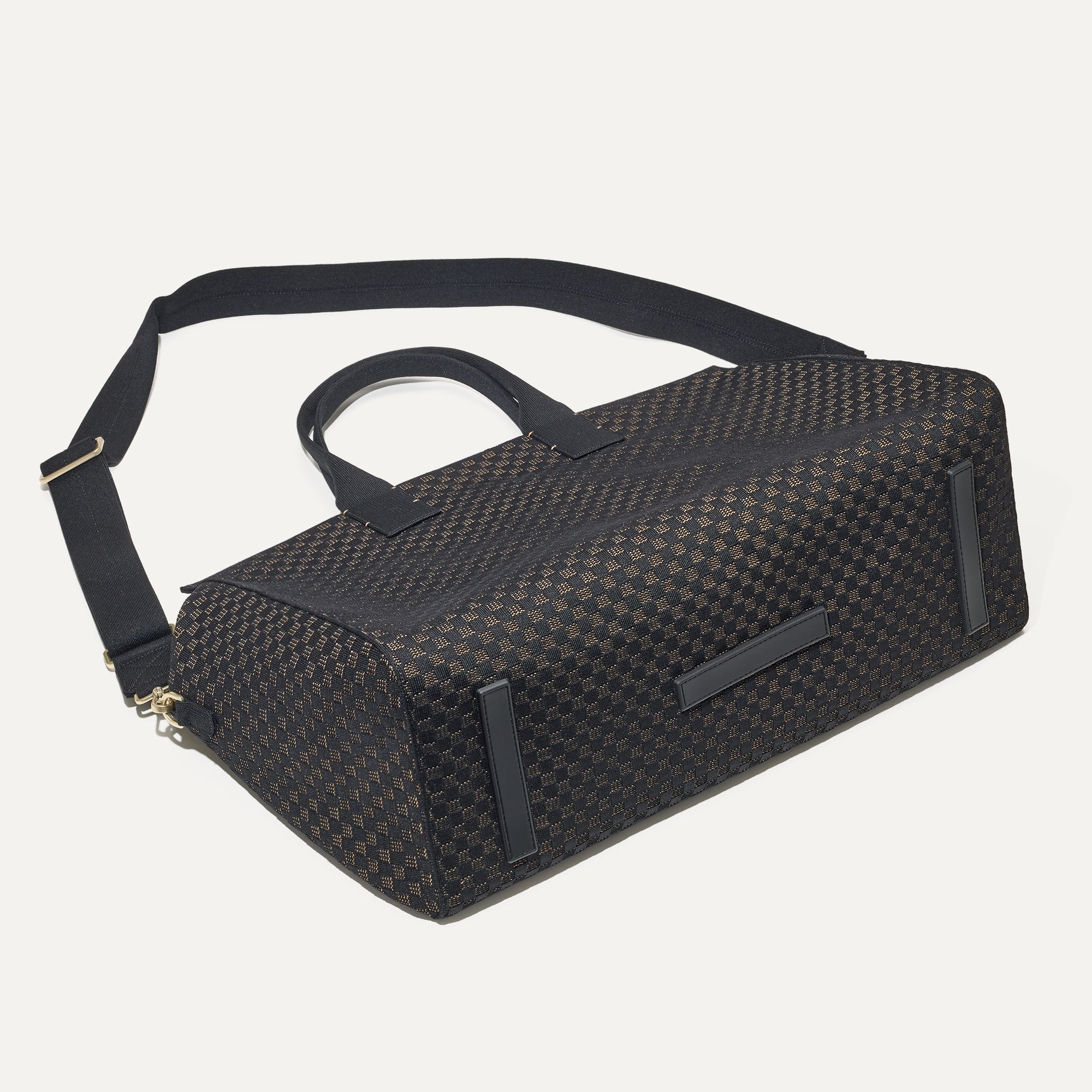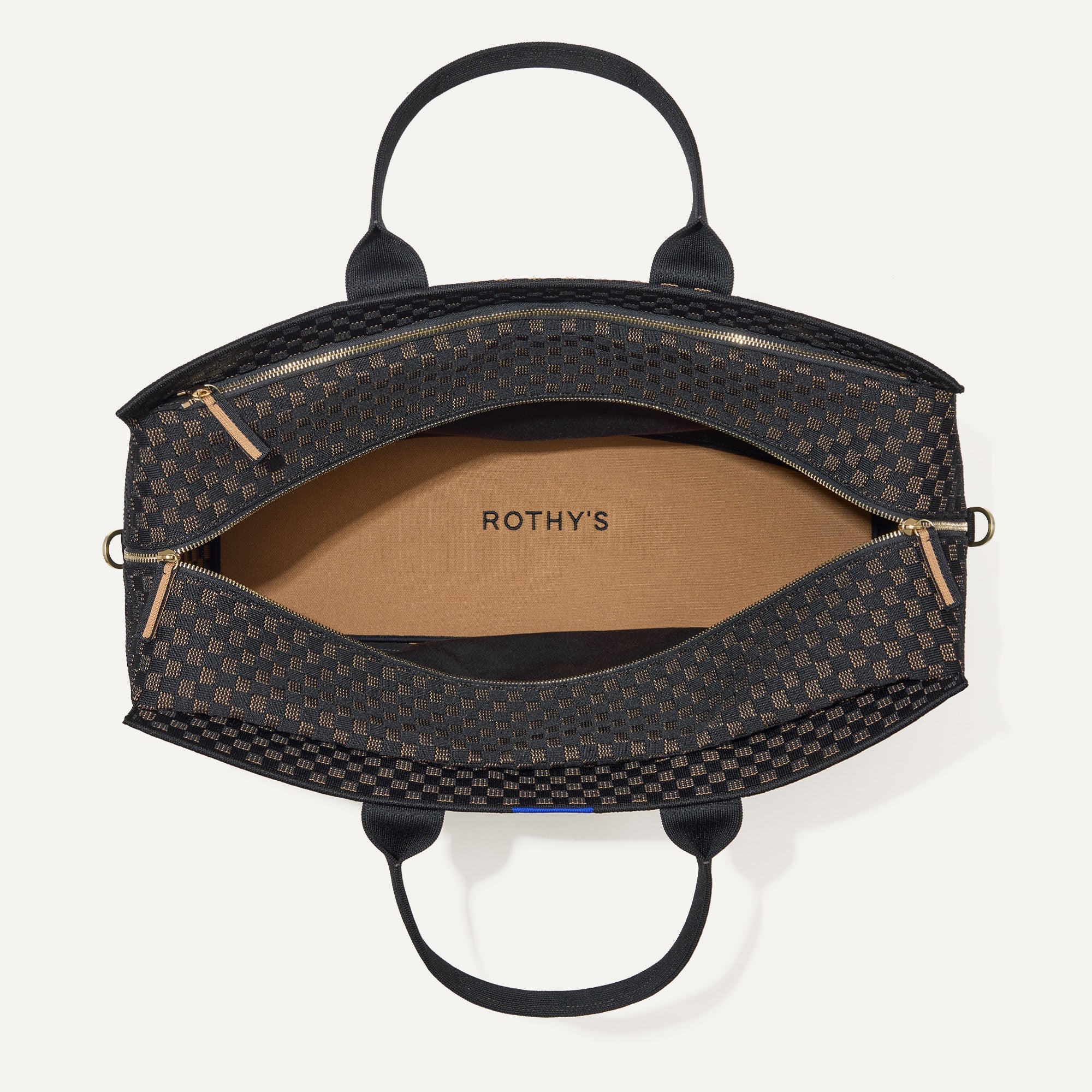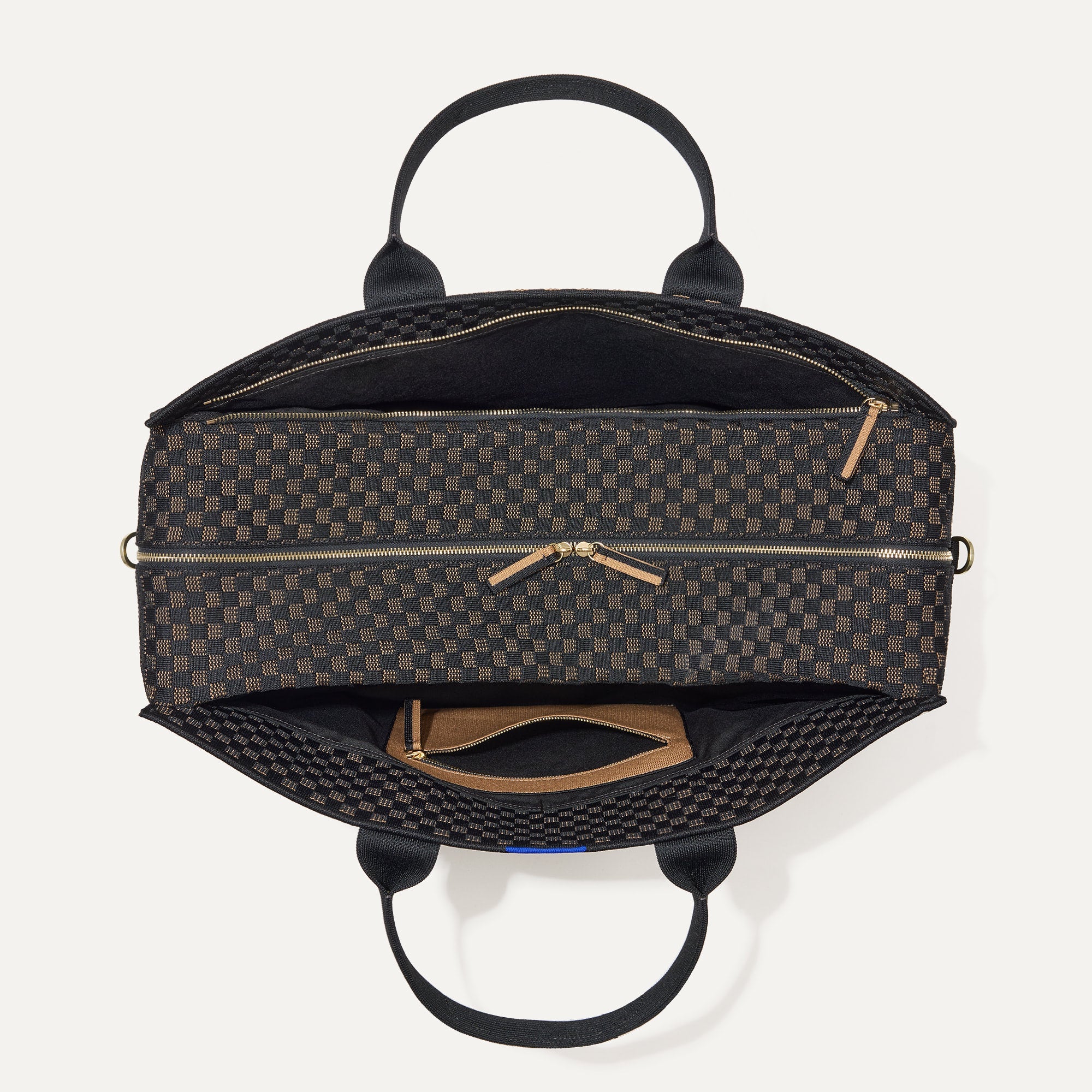Structured design in a black and camel basketweave pattern, with a double-zipper top closure and durable bag feet.